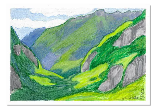 Ich versuche, regelmässig zu skizzieren, da ich meine zeichnerischen Fähigkeiten stetig weiterentwickeln möchte. So zeichne ich überall – im Alltag, in den Ferien, im ÖV und besuche speziell fürs Figurenzeichnen einen Kurs mit Modell.